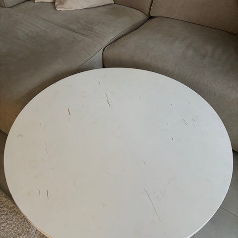 Vanha sohvapöytä. Lähinnä pinta kulumaa, lakkaamalla siisti.