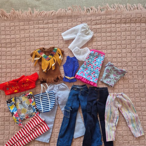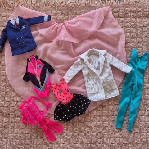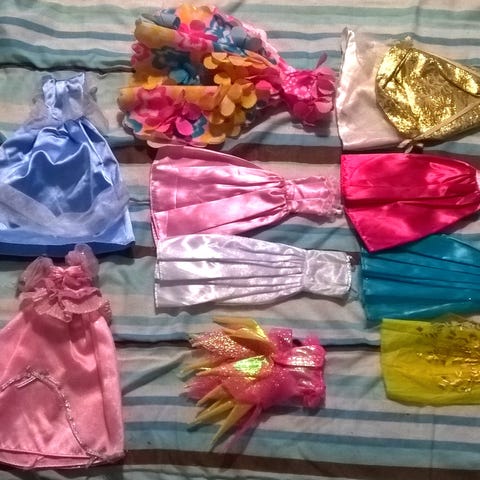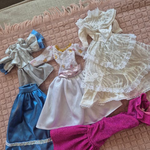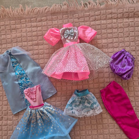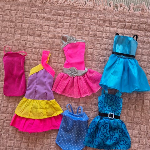 Setti ehjiä ja pestyjä juhlamekkoja Barbie nuken kokoisille nukeille.