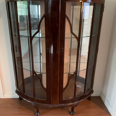 Hyväkuntoinen ja tukeva lasivitriini liukuovilla. Parissa kohtaa käytön jälkeä näkyvissä. Erotettavissa kahteen osaan.