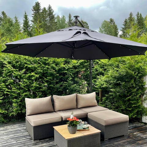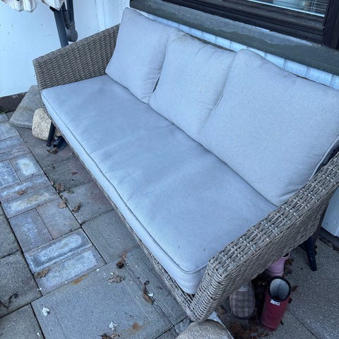Kulmamallinen ulkokäyttöön tarkoitettu terassisohva. Sohva koostuu useasta moduuliosasta, joita voi järjestellä kulmasohvaksi tai pienemmiksi kokonaisuuksiksi. Sopii parvekkeelle, terassille tai pihalle oleskelu- ja ruokailuryhmän istuimeksi. Ollut käytössä ja säälle alttiina useamman vuoden joten haalistumaa löytyy tyynyistä. Nopea nouto etusijalla.