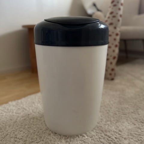 Hyväkuntoinen vaipparoskis. Mukaan saa kaksi täyttä muovipussikasettia, vajaa on roskiksessa paikoillaan.