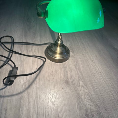 Vihreä pankkiirin lamppu kultaisella jalalla.