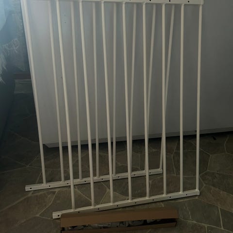 Hyväkuntoinen koira/lapsi portti. 69 leveys + lisäpituus säätöruuveilla ×77 korkeus. Ei tarvitse tehdä reikiä karmeihin. Nouto Vantaan Ilolasta.