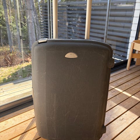 Samsoniten matkalaukku. Hyvät 2 pyörää, kovaa muovia. Toimiva lukitus. Ulkokuori maailmaa nähnyt mutta sisus erinomainen ja siisti. Vetokahva. Sisällä esim. alusvaatteille ja sukille oma sivupussukka. Mitat 65x70 cm.