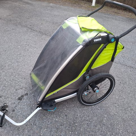 Burley Encore X, ensimmäiseltä omistajalta hyvässä kunnossa oleva jousitettu pyöräkärry 2:lle lapselle. Ollut käytössä vain n. 100km verran. Säilytetty katoksessa/lämpimässä varastossa. Kääntyvä työntöaisa, joten toimii myös kävellessä. Suuri takatila tavaroille. Max. kuormitus 45kg, yhden lapsen paino 18kg.