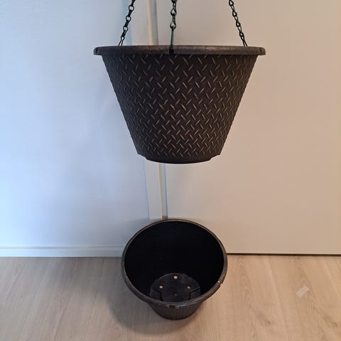 Riippuvat viherkasvit / amppelikukat punotuissa amppeliruukuissa. Kasvit myydään amppeliruukuissaan kuvien mukaisesti. Saniainen ja joku vehka. Nätit amppeliruukut.