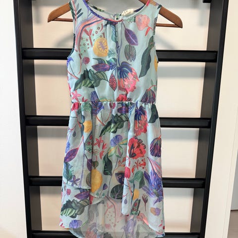 Tyttöjen kukkakuvioinen mekko, koko 146. Valkoisella pohjalla sinisiä ja vaaleanliloja kukkia. Vyötäröllä kiinni oleva sininen nauhavyö, joka solmitaan rusetille. Mekossa on kevyt, laskeutuva materiaali ja selkäpuolella piilovetoketju. Sopii esimerkiksi juhla- tai kesämekoksi.