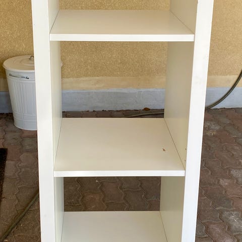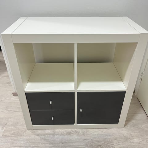 Kuvanmukainen valkoinen Ikean Kallax-hyllykoossa 1x4. Siistissä kunnossa. Mukaan saa halutessaan hyllykorit/laatikot. Toinen laatikko hieman repeytynyt mutta käytetty sitten toisin päin.