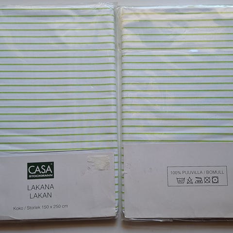 120 cm levyisen sänkyyn 2 aluslakanaa ihanaa perkaalipuuvillaa jonka langantiheys on 180. Molemmat lakanat on avaamattomassa alkuperäispakkauksessaan. Voin tarvittaessa lähettää lakanat.