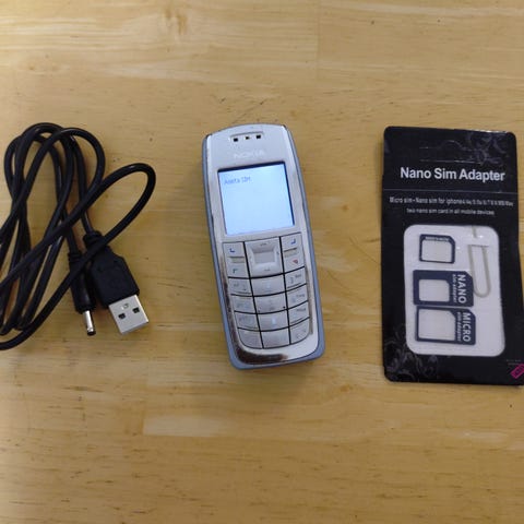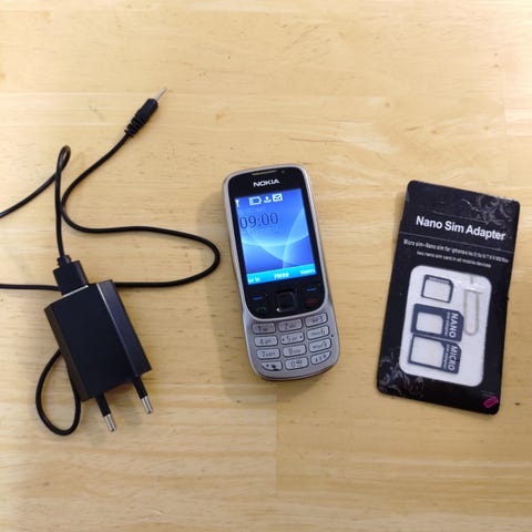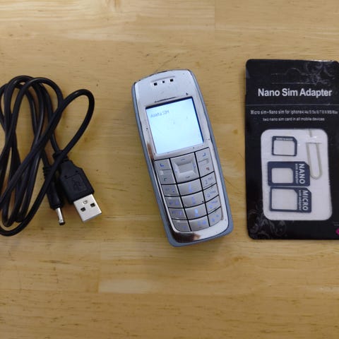 Nokia 6020 Puhelin Latauskaapelilla ja SIM-adapterisarjalla