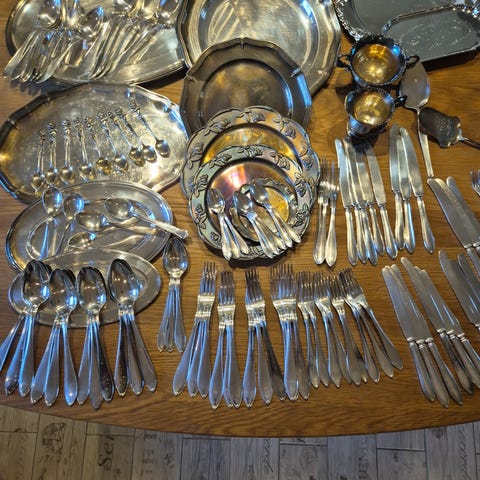 Myydään hopeoidut aterimet 55-osainen, käytetty. Salaatti-ruoka-lusikat; jälkiruoka-tee-kahvi-lusikat; veitsen; iso-keskimäinen-tarjolu-haarukat.