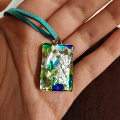 Kaunis helmen värinen riipus ja turkoosi helmet kaulanauhassa.