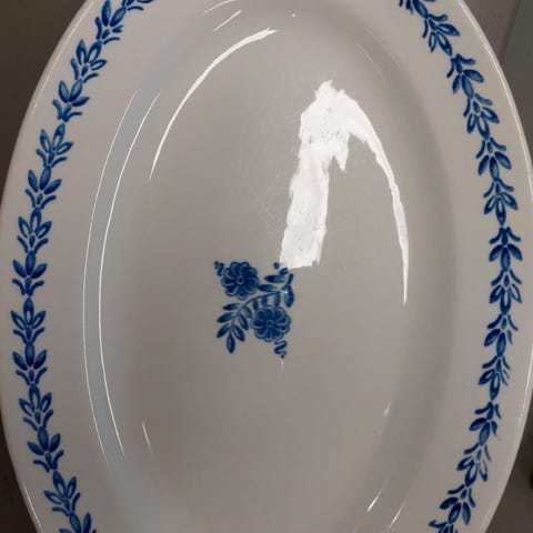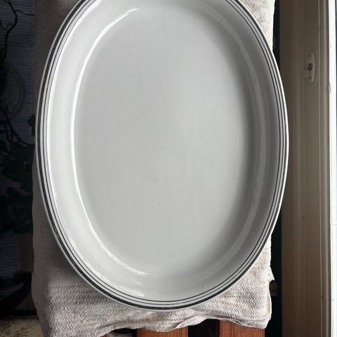 Arabia tarjoiluvati. Valkoinen posliinivati, jossa hopeanvärinen reunus ja aaltomainen muoto. Pituus noin 23 cm. Pieni halkeama pohjasta katsottuna.