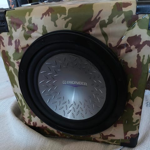 Pioneer subwoofer kaiutinkotelossa. Kotelo on verhoiltu maastokuvioisella kankaalla ja siinä on eteen suunnattu subwoofer-elementti sekä takana liitinpaneeli ja refleksiputki. Sopii käytettäväksi esimerkiksi auton tai kotiteatterin bassokaiuttimena, kunhan vahvistin ja muut laitteet ovat yhteensopivia subwooferin impedanssin ja tehonkeston kanssa.
