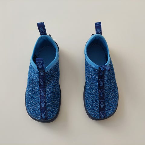 Affenzahn lasten paljasjalkakengät, koko 26. Siniset kengät, joissa punaiset tarrakiinnitykset kahdella remmillä. Joustava kumipohja, jossa pyöreäkuvioinen pito. Edessä kärjet hieman irvistää liimauksista. Tarrat pitää hyvin. Valmistajan ilmoittama sm 16,6 cm