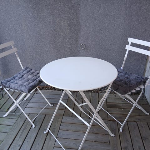 Puutarhakalustesetti, johon kuuluu kahdeksankulmainen puinen pöytä ja neljä puista taittotuolia. Pöydässä ja tuoleissa on säleikkömäinen rakenne. Pöytä ja tuolit ovat kokoontaitettavia, mikä helpottaa säilytystä ja siirtelyä. Käsitelty toissakesänä viimeksi öljyllä. Puhdistamalla käyttöön.
