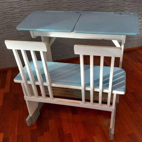 Hyväkuntoinen alaluokkalaisen kirjoituspöytä laatikoilla. Akoinaan Sotkan tai Askon myymä ja tuli meille melkein uutena.