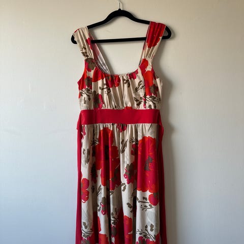 Otalia hehkuvanvärinen retro, vintage mekko. Koko M. Taskut. Viskoosia. Pieni reikä, katso kuva. Kainalo-kainalo noin 50 cm, pituus noin 115 cm.