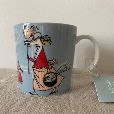 Ennen tuli keräiltyä muumimukeja, nykyään ei. Muutama muki riittää itselleni. Tyhjennän varastoa ja joitakin mukeja on useampi kappale, tai ei ole tarvetta. Mukissa tarra paikallaan ja käyttämätön.