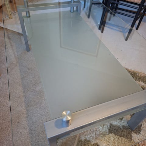 Puinen soikea lasinen sohvapöytä. Tukeva, mutta kulumaa nähtävillä.