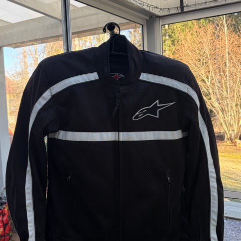 Alpinestars ajotakki moottoripyöräkäyttöön. Takissa on musta ja sininen väritys sekä vaaleat raidat edessä ja takana. Edessä vetoketjukiinnitys ja vetoketjulliset taskut. Selkäpuolella suuri Alpinestars-logo. Sisäpuolella tasku ja vuori. Koko S