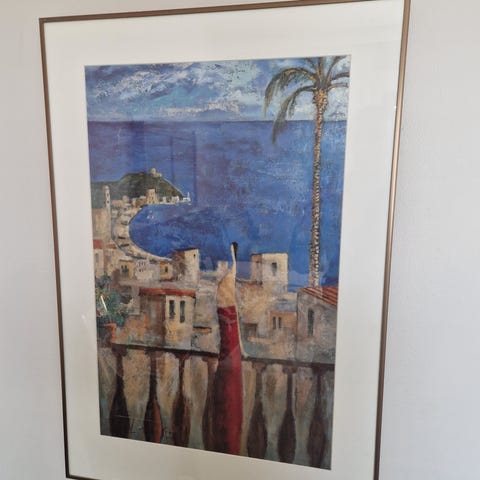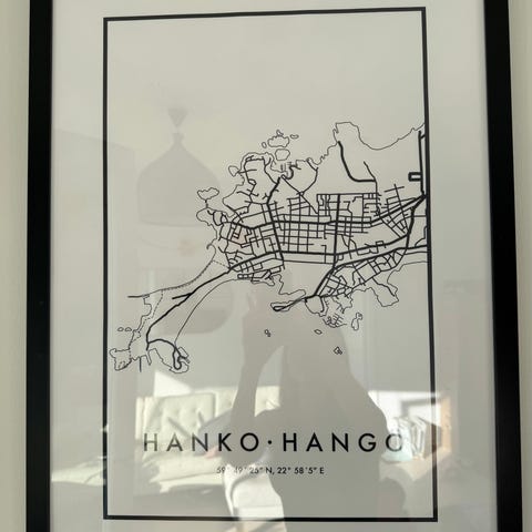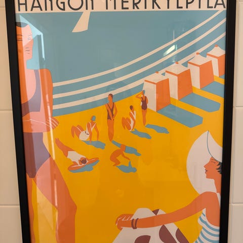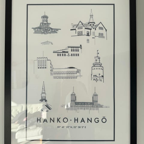 Hanko-juliste, jossa graafinen kuvitus rannalla istuvasta henkilöstä. Juliste on kehystetty mustilla kehyksillä ja taustapuolella on valmiit kiinnityskohdat seinälle ripustamista varten. Sopii sisustuselementiksi esimerkiksi olohuoneeseen, eteiseen tai työtilaan.
