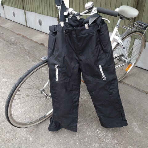 130 kokoiset housut henkselillä. Housuissa on säädettävät, ristiin menevät henkselit ja vyötärön säätömahdollisuus soljilla. Edessä on vetoketjutaskut, joissa siniset tehosteraidat. Lahkeissa on tilaa talvikengille tai saappaille.