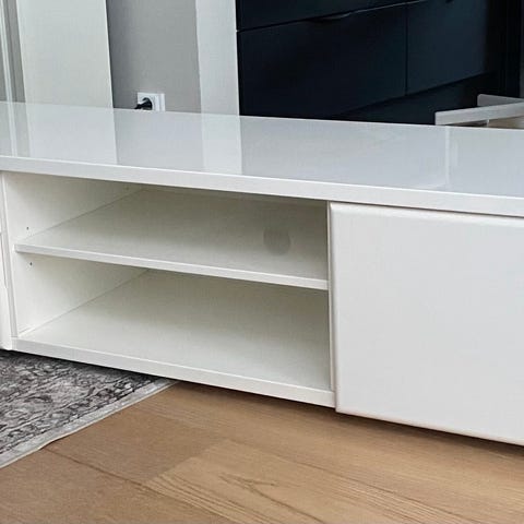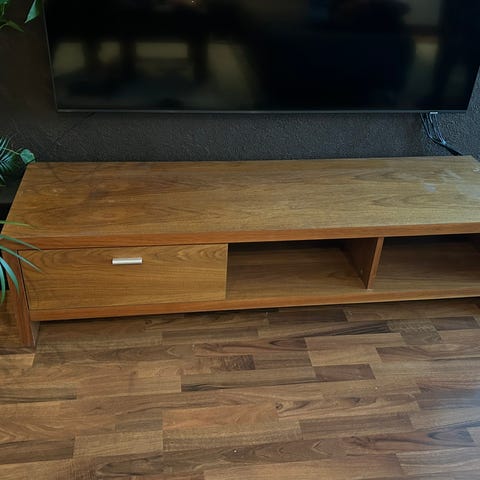 Hyväkuntoinen & käytännöllinen tv-taso, takaseinässä kaksi aukkoa johtoja varten, Kulkee pyörillä.