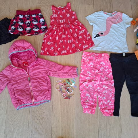 98cm tytölle: KappAhl flamingo t- paita, jossa hauskasti kuva sekä edessä että takana, H&M flamingokuosiset kesähousut ja H&M papukaijamekko. Housuissa pieni musta jälki ( näkyy kuvassa), muuten siistit.