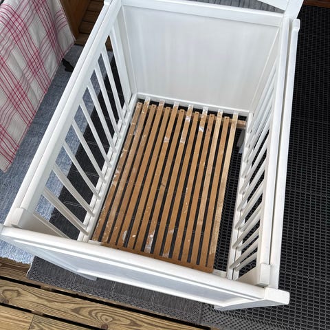 Sängyn toisella sivulla aukko. Tarvittaessa saa esim. teipillä umpeen. Mukaan patja.
