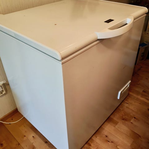 Electrolux arkkupakastin, väri valkoinen. Kansi aukeaa ylhäältä ja sisällä on useita koreja ja lokeroita elintarvikkeiden säilytykseen.