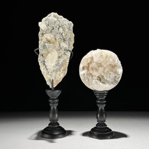 Upea pari kuutiokalkkikristallin ryhmää ja punaisen jasperin palloa.Kuuti-kalkkikuutio viittaa luonnollisesti muodostuneeseen tai keinotekoisesti muotoiltuun kalsiit-kristalliin, joka noudattaa kuutiomaista muotoa. Kalsiittiakiteutuu yleensä trigonaalisessa järjestelmässä muodostaen rhombohedraalisiä tai skaleenohedraalisiä kiteitä. Kuitenkin tietyissä olosuhteissa kalsiitti voi muodostaa kuutiokiteitä. Nämä kuutiokiteet ovat suhteellisen harvinaisia verrattuna muihin kalsiittimuotoihin. Kuutai-kalkkikiteet ovat luonteeltaan geometrian vuoksi; ne muistuttavat kuutiota, jolla on kuusi neliömäistä kasvopintaa. Kuut muun kulmissa ja kulmissa ovat usein hyvin määriteltyjä, mikä luo tasapainoisen ja esteettisesti miellyttävän kivilajien rakenteen. Kalsiitin kuutioiden muodostumiseen vaikuttavat tekijät kuten lämpötila, paine ja ympäröivän ympäristön kemiallinen koostumus. Kuutai-kalkkikiteet löytyvät tyypillisesti alueilta, joilla on tilaa kiteen kasvulle ilman muiden mineraalien häiritsemistä.Kalkkikiteet ovat kiehtovia esimerkkejä mineraalien monimuotoisista kiteisistä muodoista, jotka osoittavat kiderakenteiden luonnollista kauneutta ja symmetriaa.Punainen jasperi on jasperin erä, joka on opakeja chaldentrytä (chalcedony) -lajikkeita. Se on tunnusomaista sen punertavalle värille, joka vaihtelee syvästä tiilenpunaisesta lämpimään ruosteiseen sävyyn. Kuten muutkin jasperin muodot, punajaspersä on koostuu pääasiassa piidioksidista (SiO2) ja siinä on usein muita mineraaleja tai epäpuhtauksia, jotka vaikuttavat sen ainutlaatuiseen väritykseenLÄHETETTÄVÄN MITTAVUUDEN ARVIOT:* Kristalliryhmä --> Korkeus: 19 cm, Leveys: 9 cm* Pallo --> Korkeus: 14,6 cm Läpimitta: 7,1 cmVAROITUS> Yksi tai useampi kuva esittää tyyliteltyä vastaavaa tuotetta. Tarkat tiedot myytävästä esineestä löydät muista kuvista. Styylisen kuvan esineet eivät sisälly myyntiin.> Huomaa, että näitä tuotteita on otettu hämärässä studion tilassa, värit voivat vaihdella ympäristön mukaan.> MITÄNÄ LAIVAN PAINO sisältyy PACKEERAUSMATERIAALIIN.LAIVAN PAIKKI- Tuote lähetetään seurantakoodilla DHL Parcelin, DPD:n tai postNl:n kautta. Seuranta päivittyy Catawiki-tililläsi, kun paketti on jätetty kuljetukseen.- Tarkista säännöllisesti, jotta pakettisi ei palautuisi meille, jolloin ostaja vastaa toisen lähetyksen toimituskustannuksista.- Espanjaan ja Portugaliin suuntautuva seuranta: käytä tätä linkkiä ja lisää Catawiki-tililtäsi saamasi seurantanumerohttps://clientesparcel.dhl.es/LiveTracking/Home- EMME YHDISTÄ SEURANTOJA KUORIN LÄHETYSTIÄ!- Jos sinulla on kysyttävää paketistasi, ota meihin yhteyttä Catawiki-viestipalvelun kautta. Yritämme vastata 3 arkipäivän kuluessa.