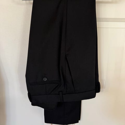 Musta kaksiosainen puku, jossa takki ja kahdet housut. Materiaalina villasekoite (45% villa, 53% polyesteri, 2% elastan).