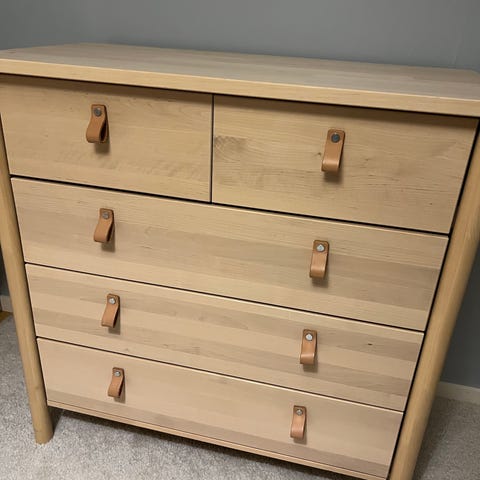 Ikean Hemnes-lipasto, valkoiseksi petrattu kokopuinen. Kannessa muutama maalirikko. Hajusteeton ja eläimetön talous.