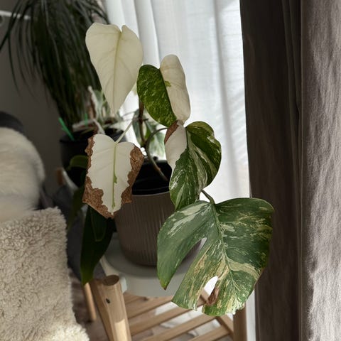 Myydään pieni Monstera Deliciosa Albo Variegata sekä sen sisäruukku. Pistokas otettu viime syksynä ja nyt myyn eteenpäin hyvään kotiin, juurtunut hyvin ja kasvattaa uutta lehteä säännöllisesti, viimeisin lehti puoliksi valkoinen eli hyvin pigmenttiä mukana. Hieman kuivumista liian kuivan sisäilman takia.