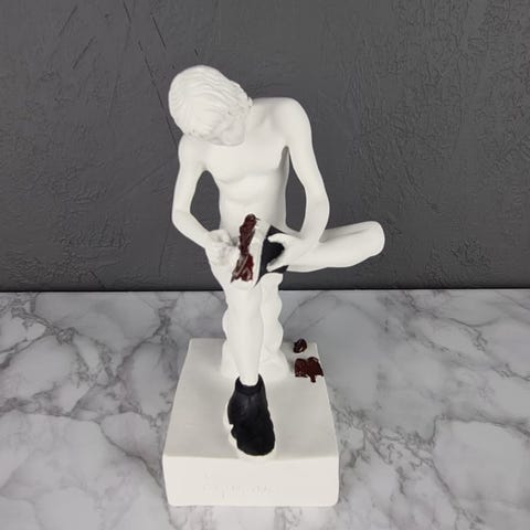 Santicri on osallistunut moniin kansainvälisesti tunnettuja taidetapahtumia. Merkittävimpiä kuten vuonna 2022 hän otti teoksensa esiin Genovan kuuluisassa Palazzo Grillo -palatsissa, ja vuonna 2023 hän oli läsnä International Contemporary Furniture Fair (ICFF) -tapahtumassa New Yorkissa, laajentaen siten näkyvyyttään sekä kansainvälisissä että kotimaisissa yhteyksissä.Santicri on tunnustettu 2024 Best-Selling Artists -listan jäseneksi Artmayeurin toimesta, eräälle maailman tunnetuimmista taidealustoista. Samana vuonna hänet lisättiin myös Catawiki-palvelun kolmen eniten etsityn nimen joukkoon, mikä on lisäkitekin osoitus hänen työnsä kasvavasta arvostuksesta. Nämä tunnustukset korostavat Santicrin poikkeuksellista lahjakkuutta ja kasvavaa näkyvyyttä nykytaiteen kentässä.Santicri-artistTekniikka: RESIINI ja marmoripölyMitat: K 17 x L 10 x S 10 cmTila: uusiAutenttisuustodistus – käsin signeerattuEdition: BalenciagaSculptuuri on provokatiivinen taiteellinen ilmaus. Tämä teos vaikuttaa haastavan perinteiset käytännöt ja odotukset taiteessa sekoittamalla vanhoja ja moderneja elementtejä yllätyksellisessä kontekstissa.Valinta esittää spinario-nimisen, klassisen taiteen tyypillisen aihepiirin, niin epätavallisessa ja nykyajassa kontekstissa viittaa havaintoon nykykulttuuristamme sekä suhteestamme menneisyyteen. Balenciaga-kenkien käyttö ja plop-vaikutelman kaltaisena poistamisen kohtaus voidaan tulkita korostettuna kritiikkinä kulutusta ja luksuksen pakkomiellettä kohtaan nykyaikaisessa maailmassa.Teos näyttää haluavan herättää yleisössä reaktion, herättää kysymyksiä symboliikastaan ja syvemmästä merkityksestään. Tämä nykytaideteos vaikuttaa rohkealta kommentilta nyky-yhteiskunnasta, sen kulutusorjuudesta sekä suhteestaan historiaan ja perinteeseen.Käsin signeerattu taiteilijan allekirjoituksella ja autenttisuustodistusmyytävän teoksen sarjanumero saattaa poiketa kuvan numerosta.Taiteilija on vakiinnuttanut asemansa vuonna 2024 yhtenä Catawikiin eniten haetuista nimistä, sijoittuen välittömästi ikonien kuten Kawsin ja Banksyn jälkeen. Hänen taiteensa erottuu eksklusiivisessa kontekstissa, johon kuuluvat muut erinomaisuuden kategoriat, kuten Rolex, Lego, Louis Vuitton, Porsche, Eames, Macallan, Tintin, Cartier ja Pokémon. Taituruutta ei tunnusteta vain luovasta arvosta, vaan myös yhtenä tämän vuoden lupaavimmista sijoituksista.Syntynyt vuonna 1992 Maceratassa, Marche, italialainen taiteilija suoritti geometriaan ja arkkitehtuuriin liittyvän polun, joka johti yhteistyöhön resin-taidekividesartehtaan kanssa. Siellä syntyi tarve löytää itsensä ja päästää luovuus valloilleen.Hänen teoksiaan myydään maailmanlaajuisesti, yhteistyössä gallerioiden kanssa Italiassa ja Euroopassa.Hänen taiteensa on laajalti arvostettua, eikä sitä voi puuttua katsojien ja street artin, pop-artin sekä nykytaiteen keräilijöiltä."Ei ole koskaan helppoa luokitella omaa taidetta, yritän välittää sen, mitä silmäni näkee, tapani nähdä ympäröivä maailma, ja muokkaan sen designiksi, joka kohtaa modernin ajan ja on vaikuttava sekä mieleenpainuva."