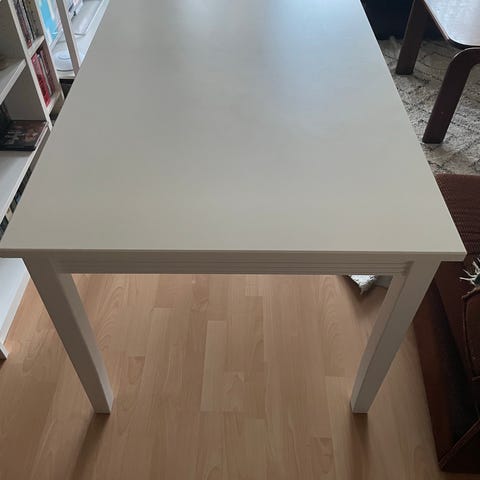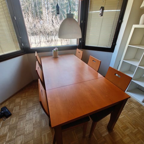 Käytetty mutta ehjä ryhmä. Pöytä ja tuolit tukevat. Kolhuja ja naarmuja löytyy niinkuin käytetystä löytyy mutta vallan mainiosti käyttökelpoinen setti. Koiratalous.