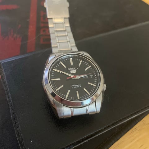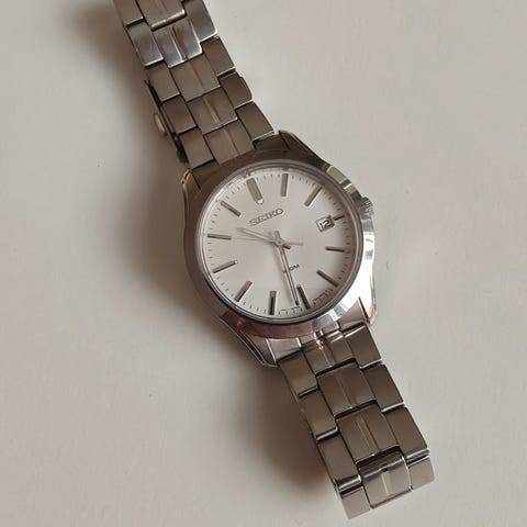 Seiko miesten rannekello. Kellossa on musta kellotaulu, jossa on tunti- ja minuuttimerkinnät sekä päivämääränäyttö. Ranneke ja kuori ovat terästä, ja rannekkeessa on taittosolki.