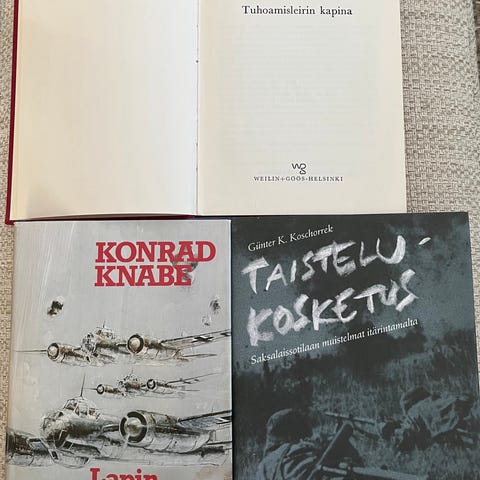 Myynnissä 6 sotakirjaa: Reino Lehväslaihon "Sissivääpeli", Arvi Matilaisen "Korpisoturit", Niilo Lauttamus "Korpipartio", Jorma Kurvinen "Viimeiseen Mieheen" Antti Tuuri "Elämä isänmaalle" Airi ja Rafael Koskimies " Suomen Lotta" Teokset ovat kovakantisia. Kirjat käsittelevät sotateemaa ja sopivat aiheesta kiinnostuneelle lukijalle tai kokoelmaan täydennykseksi.