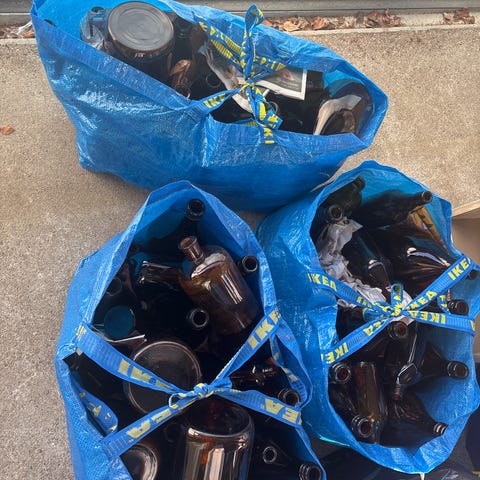 23 kpl lasipulloja ja -maljakoita. Käytetty häissä kukille maljakoina.
