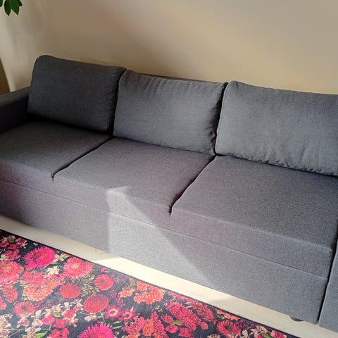 Sotkasta noin viisi vuotta sitten ostettu tummanharmaa kolmen istuttava sohva. Pinnoiltaan vielä erittäin siisti ja ryhdikäs. Selkätyynyjen takana sohvassa nyppääntymistä materiaalista johtuen.