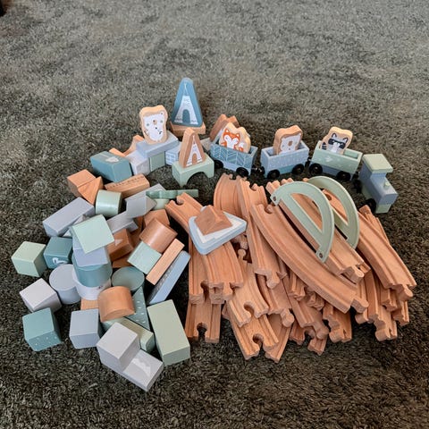 Junassa on veturi ja kaksi vaunua, joissa on irrotettavia palikoita ja numero- sekä kuvioaiheita pastellisävyissä.