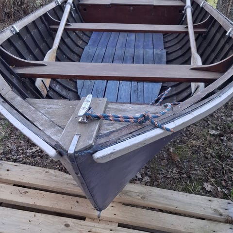 Myydään soutuvene, takanurkassa lohkeama. Ei airoja