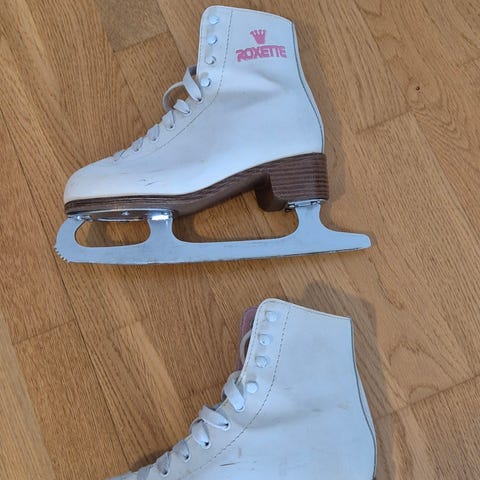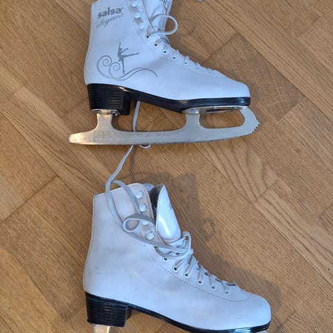 Naisten Sabina-merkkiset taitoluistimet, koko 37. Valkoiset, ajan kanssa hieman kellastuneet nauhalliset luistimet, joissa korkea varsi. Sopii hyvin nuorelle tai pienijalkaiselle aikuiselle.