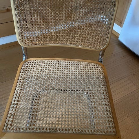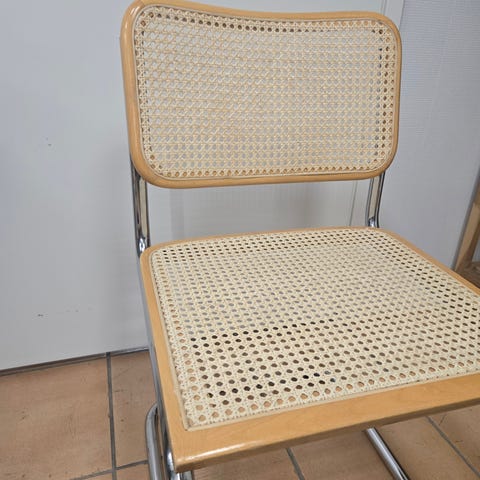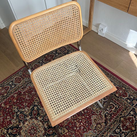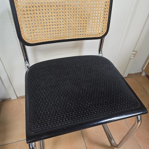 Musta venetsiatuoli. Istuinosa on ollut alunperin valkoinen, maalattu mustaksi. Ehjät rottinki, joka on tosi napakka istuimessakin. Voidaan kuljettaa tai lähettää.
