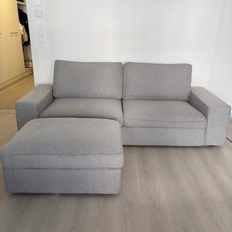 Sohva ja erillinen rahi Ikeasta. Päälliset uusittu 2-vuotta sitten Bemz verkkokaupasta, joka myy päällisiä Ikean sohviin. Tätä väriä ei ole siis Ikeassa saatavilla. Väri vaaleanbeige. Rahissa säilytystilaa sisällä. Sohva hyvässä kunnossa.
