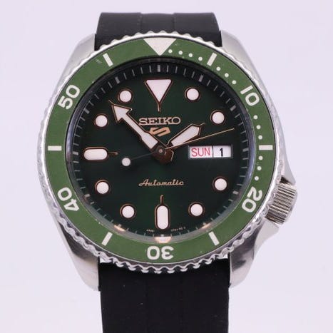 —// KUVAUS //—Malli: Seiko 5 Sports SRPD63K1 vihreä Kellotaulu, miesten automaattinen urheilukelloMateriaali: Pinnoitettu teräsKellotaulun väri: VihreäKellotaulun koko: 41 mm ( ilman kruunua )Koko/Istuvuus: Ranteen ympärys jopa 20,0 cm.Käynti: Seiko 4R36 automaattinen koneistoAkunvaraus: 40 tuntiaToiminnot: Aika, hacking, manuaali- ja automaattinen winde, viileäsekunnin liikuttaja, pyöritettävä sukellusrulla, päivä ja päivämäärä näytössä, kaksikielinen päivämääräpyörä, valonhehkuiset Kädet ja tuntimerkit—// PAKKAUS //—Alkuperäinen laatikko: EiAlkuperäiset paperit: Ei—// KUNTO //—Koteloon kulumaa: *(*) [enimmäkseen hiusviiloja sivulla. ei merkittäviä töyssyjä tai viiloja]Kotelon takakannen kulumaa: *(*) [joissakin hiusviiloja näytön takakannessa ja sen ympärillä]Kristallin kulumaa: * [minimaalista hiusviiltoa]Kellotaulun kulumaa: - Käsien kulumaa: - Rullan/kellopuun kulumaa: *(*) [Pienikin kuluma bezelerillä, maali irronnut, katso kuvat]Kruunun kulumaa: -(*)Rannekorun tai hihnan istuvuuden mukaan: - [Jälkimarkkinat mustat kumihihnat, jälkimarkkinat metallilukko]KUNTO RATING -STANDARD:- None (Paras)* Mitättömän** Pieni*** Keskivahva**** Raskas***** Vaurioitunut (Worst)