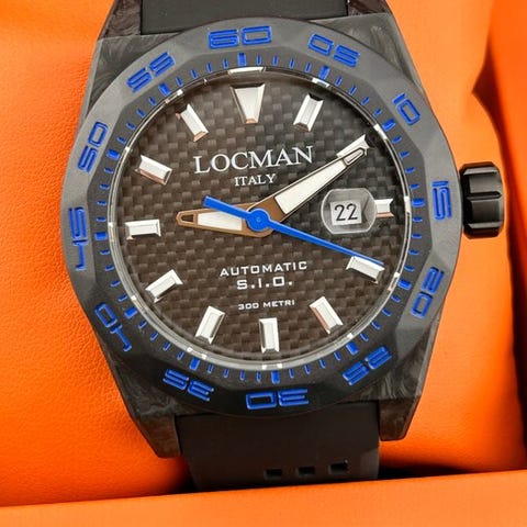 Marca: Locman Modello: Stealth Carbon 300 metri Automatic Movimento: Automatico Misura cassa: 46mm esclusa corona Materiale cassa: Carbonio Misura cinturino: 22cm totali Corona: a vite , Logata Quadrante: fibra di carbonio Fondello: Serrato a vite in titanio Condizioni: NUOVO Garanzia ufficiale LOCMAN Corredo: set completo STEALTH 300 METRI Quando si crede di aver raggiunto i limiti, si cerca di superarli. E così Locman ha deciso di sfondare il muro dell’estremo con una collezione di orologi super-tecnici, progettati nei minimi dettagli per fornire le migliori prestazioni possibili. Il carbonio forgiato con cui è composta la cassa è leggerissimo, eppure in grado di resistere alle sollecitazioni esterne più estreme. Non sono poi molte le marche in grado di padroneggiare questo materiale. LOCMAN lo usa da quasi due decenni. La cassa è in carbonio forgiato, lavorato da un solidissimo blocco di materiale, estremamente leggera a dispetto delle dimensioni (46 mm di diametro). Per garantire a chi la indossa l’assoluta biocompatibilità, il fondello è in titanio; ed è fissato da 4 viti, che evitano il benché minimo stress alle guarnizioni, a cui assicurano lunga vita. All’interno, la versione solo tempo ospita un calibro a carica automatica rielaborato dalla SIO La lunetta invece è realizzata in ABS, materiale sintetico insensibile agli urti e alle variazioni di temperatura. Girevole unidirezionale, è sagomata “a diamante” con sfaccettature dagli spigoli arrotondati, per consentire un’ottima presa anche con i guanti della muta. Il quadrante in fibra di carbonio evita fastidiosi riflessi, ma risulta ben leggibile in ogni condizione di luce grazie all’abbondante materiale luminescente (Super-LumiNova) che riveste le lancette. Il cinturino in silicone, morbido e anallergico, presenta strategici fori per agevolare la fuoriuscita dell’acqua.