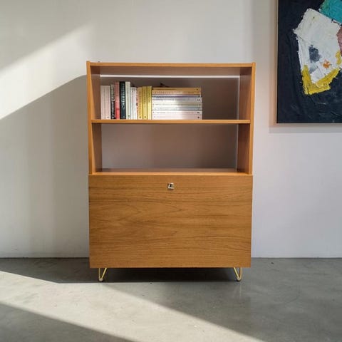 Kapea vintage palisanteri hylly kaapilla, avo-osassa hyllylevy ja alaosassa lukollinen kaappi. Hyllylevyn saa pois ja kaappiin on avain.