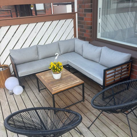 Kulmasohva ulkokäyttöön, valmistettu harmaasta polyrottingista. Sohva koostuu kahdesta moduuliosasta, jotka muodostavat kokonaisuuden sekä erillisestä rahista/jalkarahista. Istuimissa ja selkänojissa on vaaleat, paksut pehmusteet. Runkomateriaali on säänkestävää polyrottinkia, joka soveltuu terassille tai parvekkeelle.